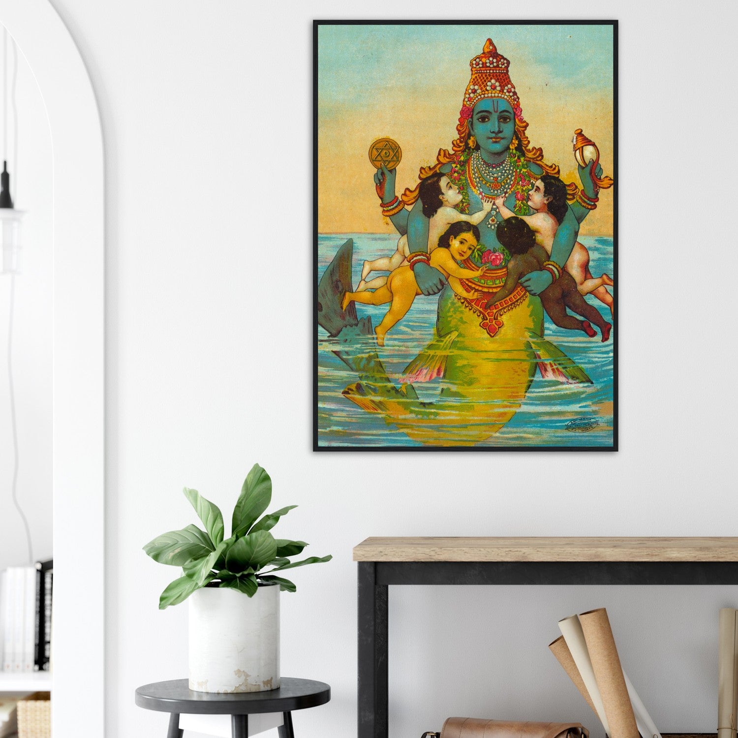 Improve the atmosphere of your space with the Matsya Avatar Print, a refined tribute to the first incarnation of Lord Vishnu. Crafted with attention to detail, this Print combines symbolic artistry with cultural reverence, making it a distinguished addition to any setting. Perfect for those who appreciate spiritual heritage presented in a tasteful and elegant form.